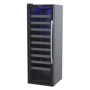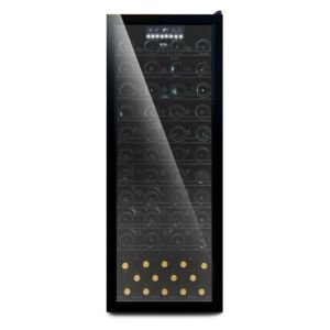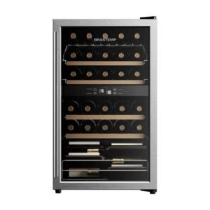 A faixa de temperatura é ampla, de 5°C a 20°C, permitindo acomodar desde espumantes até vinhos do Porto. O controle é eletrônico e a porta de vidro duplo oferece proteção contra a luz externa. As prateleiras em aço inox são robustas e projetadas para suportar o peso da coleção completa. Apesar de seu tamanho e capacidade, ela foi projetada para ter uma baixa emissão de ruído. Sem dúvida, está entre as melhores adegas com compressor para quem pensa grande.